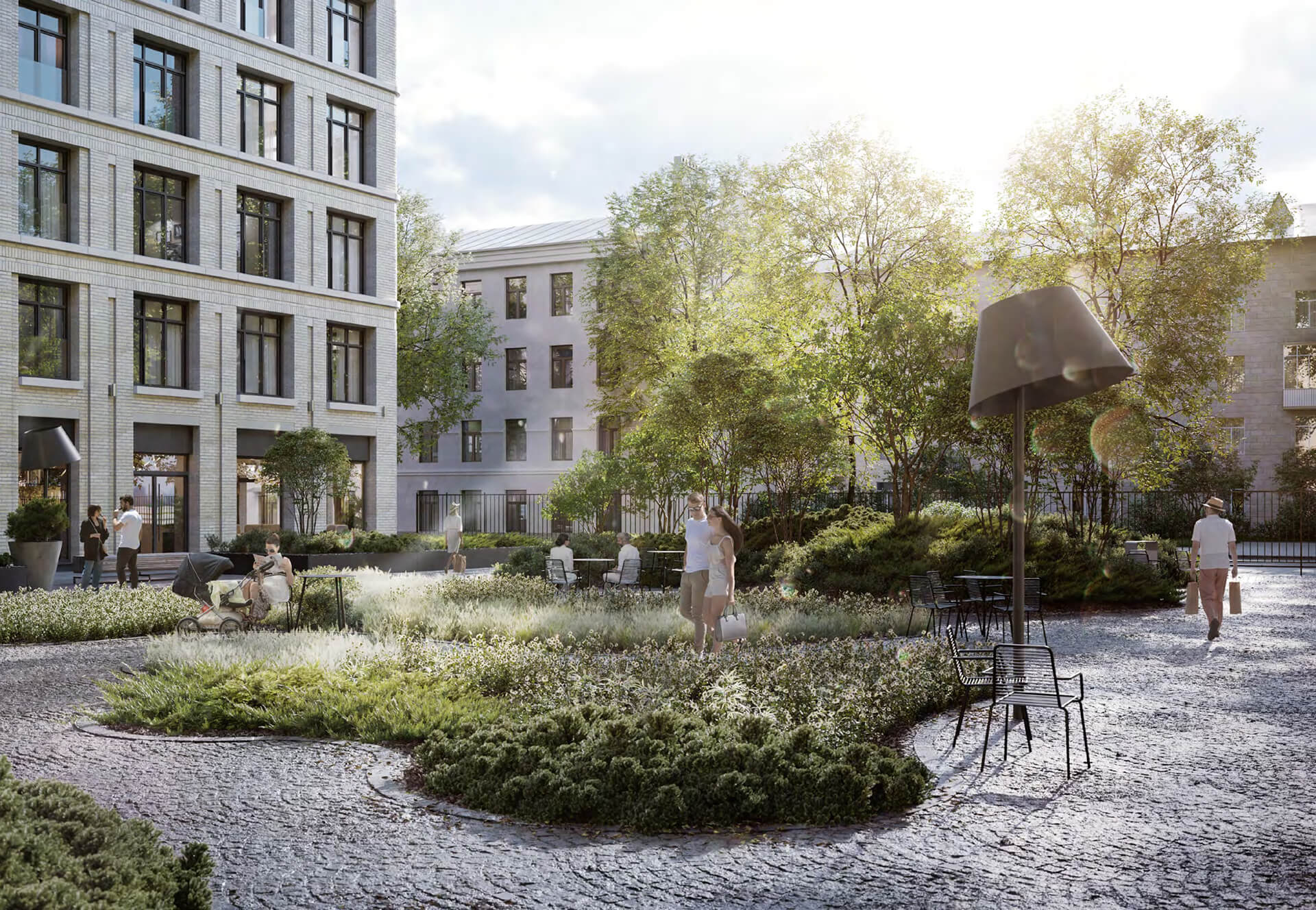 Инновационные решения позволили создать комфортные зоны отдыха с обогревателями, а также оборудовать пространство свободным Wi-Fi. Особое внимание уделено ландшафтному дизайну — зелёные насаждения, деревья и дизайнерские малые архитектурные формы делают двор уютным и живописным.