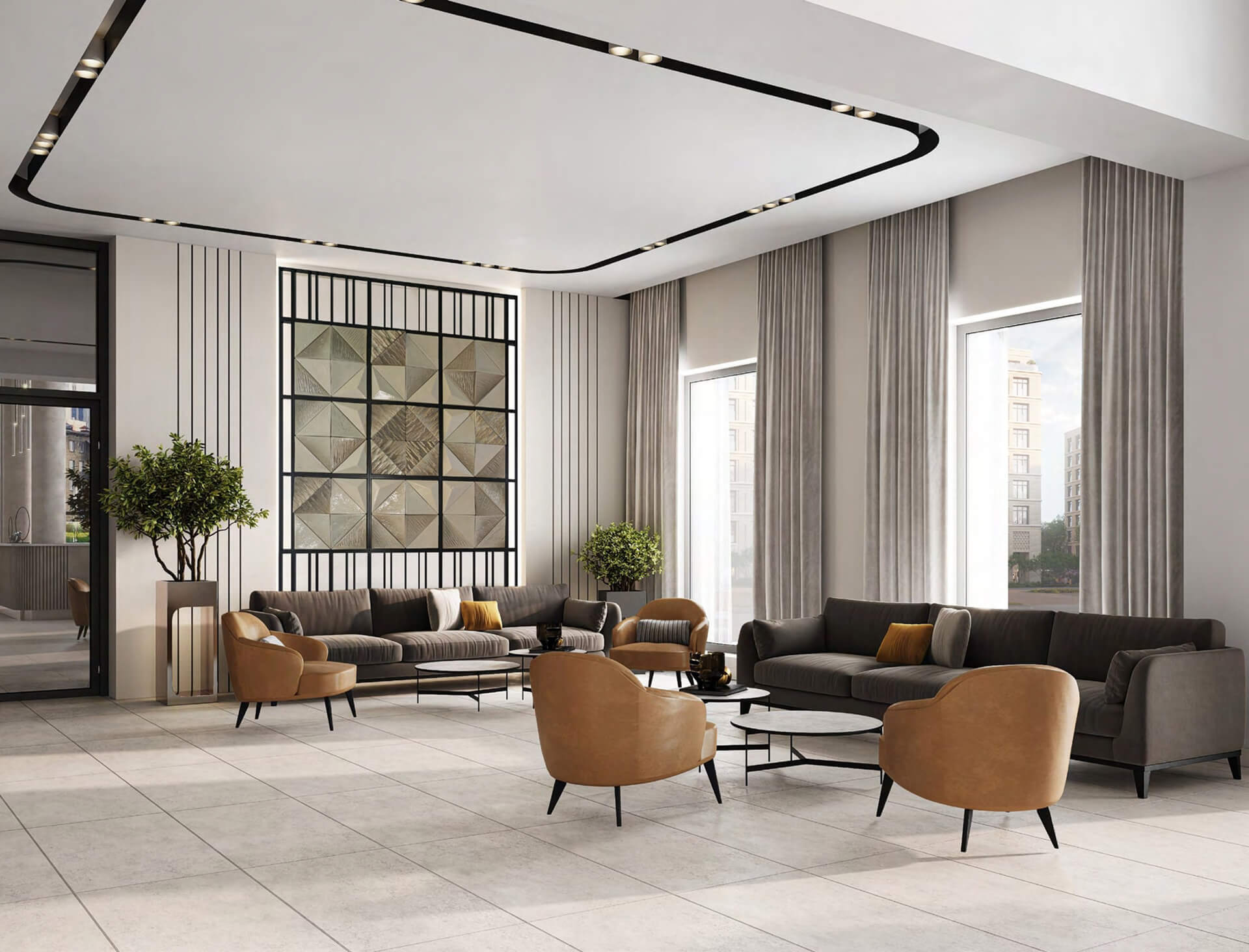 Интерьеры общественных зон выполнены в авторском дизайне с элементами современного искусства. В оформлении лобби использованы керамические панно работы Юлии Клоповой, создающие атмосферу эксклюзивности и уюта. Пространство холлов наполнено светом благодаря высоким потолкам и панорамному остеклению, а стильная мебель и дизайнерское освещение подчёркивают статусность комплекса.